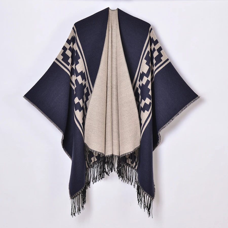 This oversized navy pashmina is going to keep you warm and cozy during the colder days. This pashmina features a distinctive geometric print and it is also reversible which allows to match it to even more outerwear!